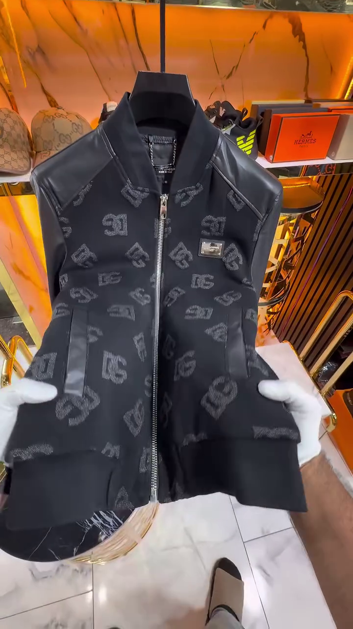 • The Black & Grey Motif: The body of the jacket features a sophisticated monogram or logo print in shades of charcoal and midnight. This “grayscale” approach ensures the pattern remains masculine and versatile, rather than overwhelming.