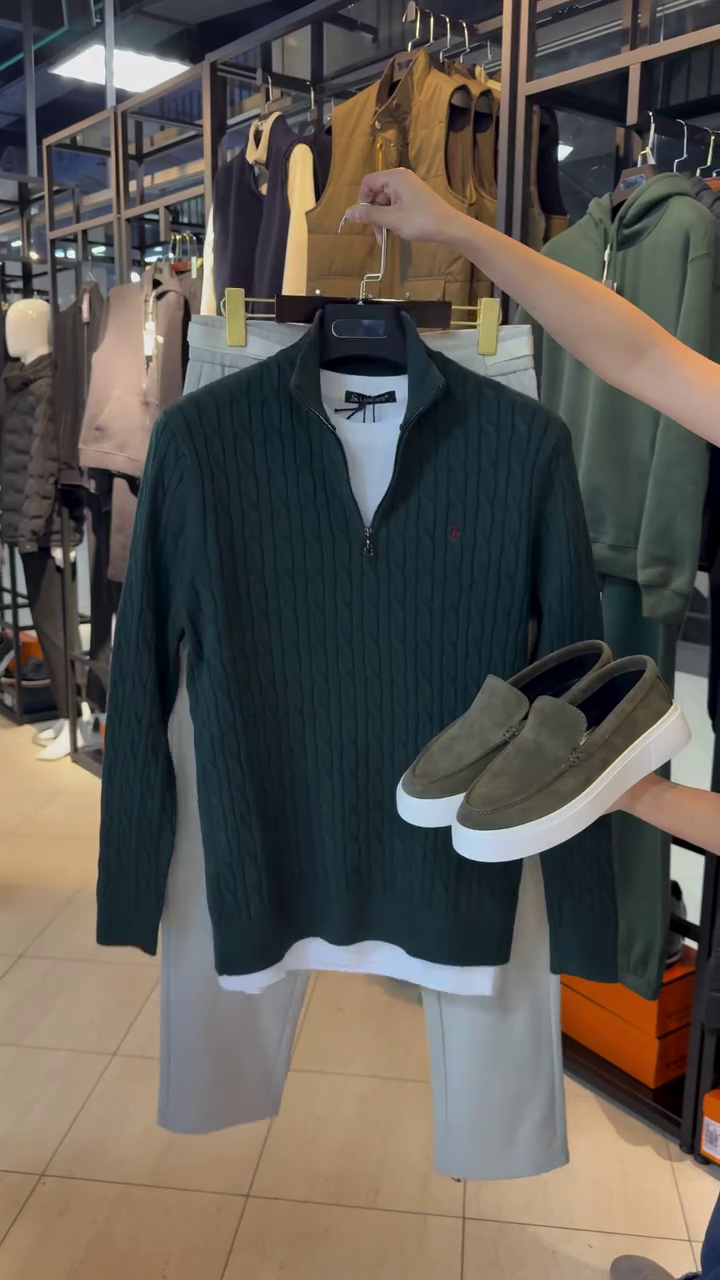 Varied Textures: The mix of Cable-Knit (Wool/Cotton) + Smooth Trousers (Twill) + Soft Loafers (Suede) creates “Tactile Depth,” which makes an outfit look expensive and well-thought-out.